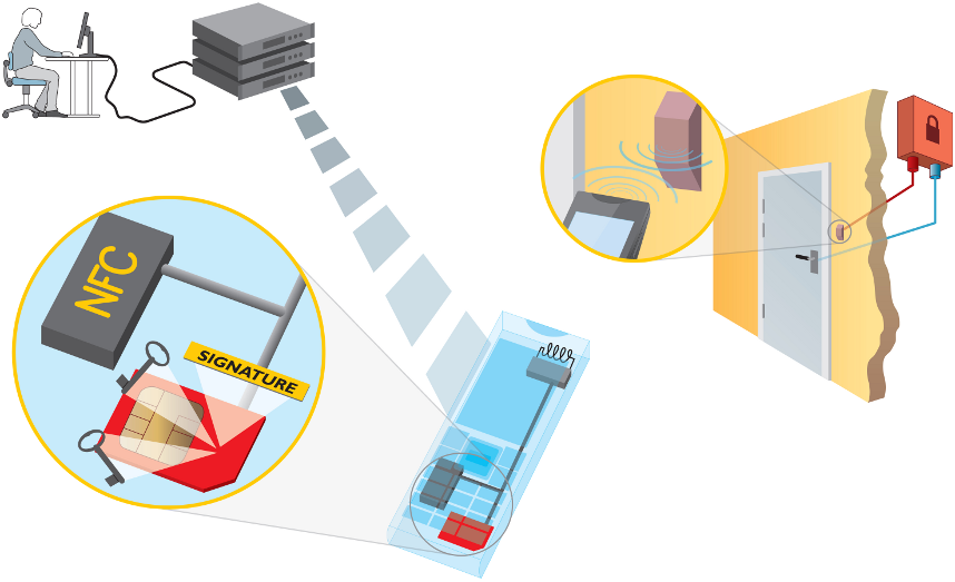 In a traditional access control system the card communicates its ID to the reader, which compares this information to a list of allowed IDs. In Telcred’s system it works the other way around – the lock controller is aware of its own ID and gets information about the device’s access rights from the device at the time of access. The lock controller then compares the information in the ticket it just received to its own known ID, which does not change over time. This innovation makes it possible for Telcred’s system to cope with frequently changing users and temporary access rights. The tickets have a set validity period, are issued for a specific device, and are cryptographically signed by Telcred’s administrative system, which guarantees that they cannot be faked, copied or changed.