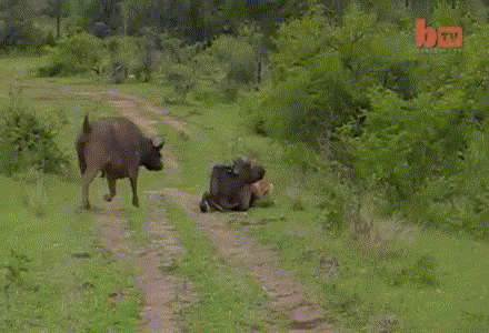 JUDÔ NAS SELVAS, FERA! — Búfalo protegendo sua família dá violenta chifrada em leão e joga temível felino para o ar. Um golpe de mestre. Veja animação em <http://goo.gl/wTQvBh>.