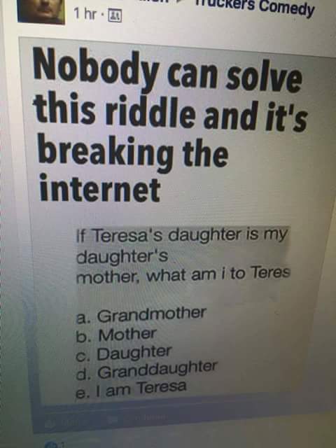 Se a filha da Teresa é a mãe da minha filha, eu, que faço a pergunta, só posso ser a filha da Teresa.