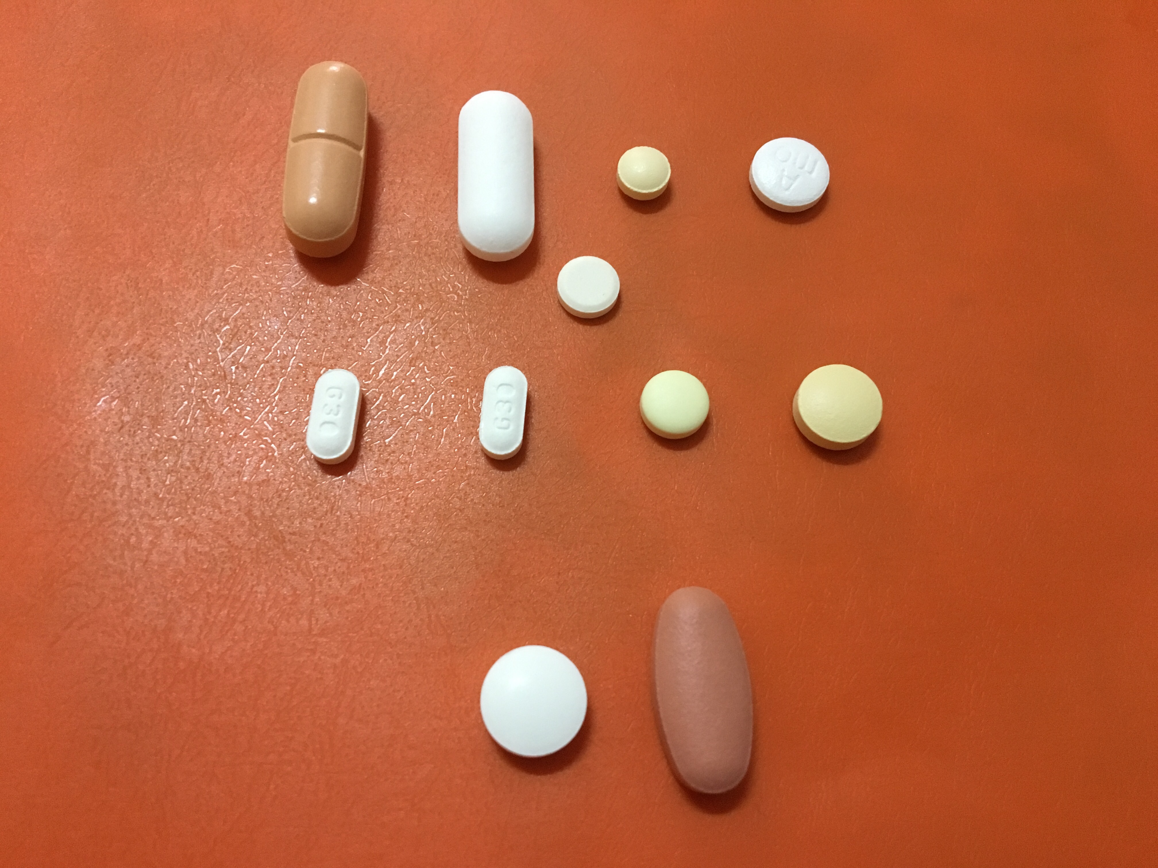 Minha dose matinal de comprimidos. Os dois de baixo são para a sinusite que me derrubou esta semana. O resto é de uso contínuo — hipertensão, diabetes e colesterol alto.